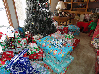The above two pictures are all the presents. This picture doesn't really show how high the pile was or show how beautiful the Christmas tree was.